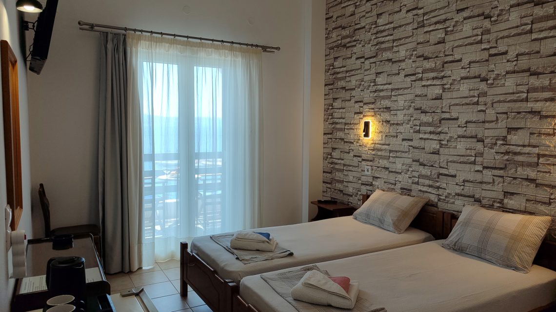 Unwind in our inviting twin room with a sea view. Featuring two beds for a comfortable stay, the room opens up to a balcony where you can soak in the beauty of the Piso Livadi Bay and the Aegean Sea!